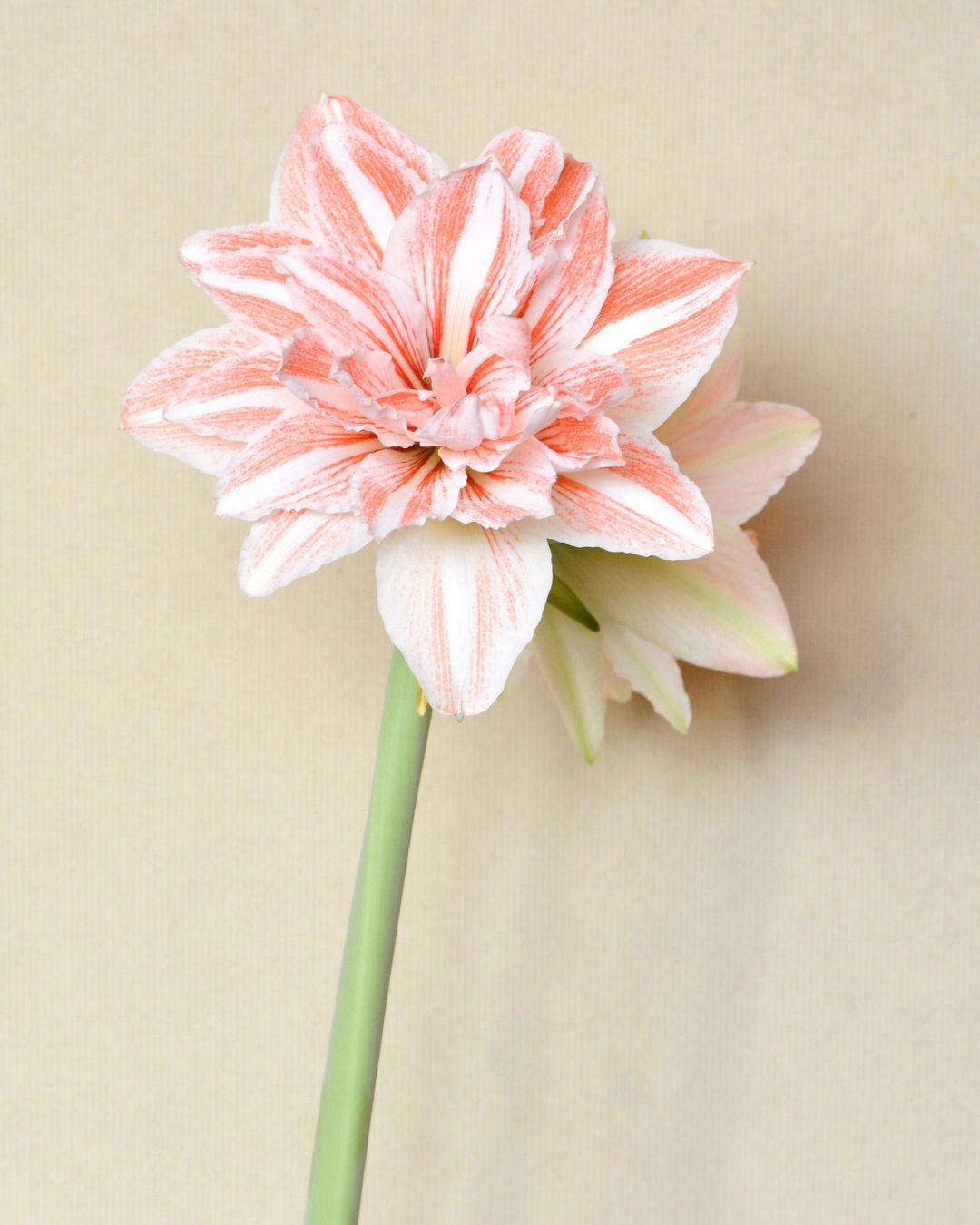 Amaryllis 'Dancing Queen' har store, doble blomster i hvitt med striper av korallrødt. Den kan få blomsterdiameter på opptil 23 cm.