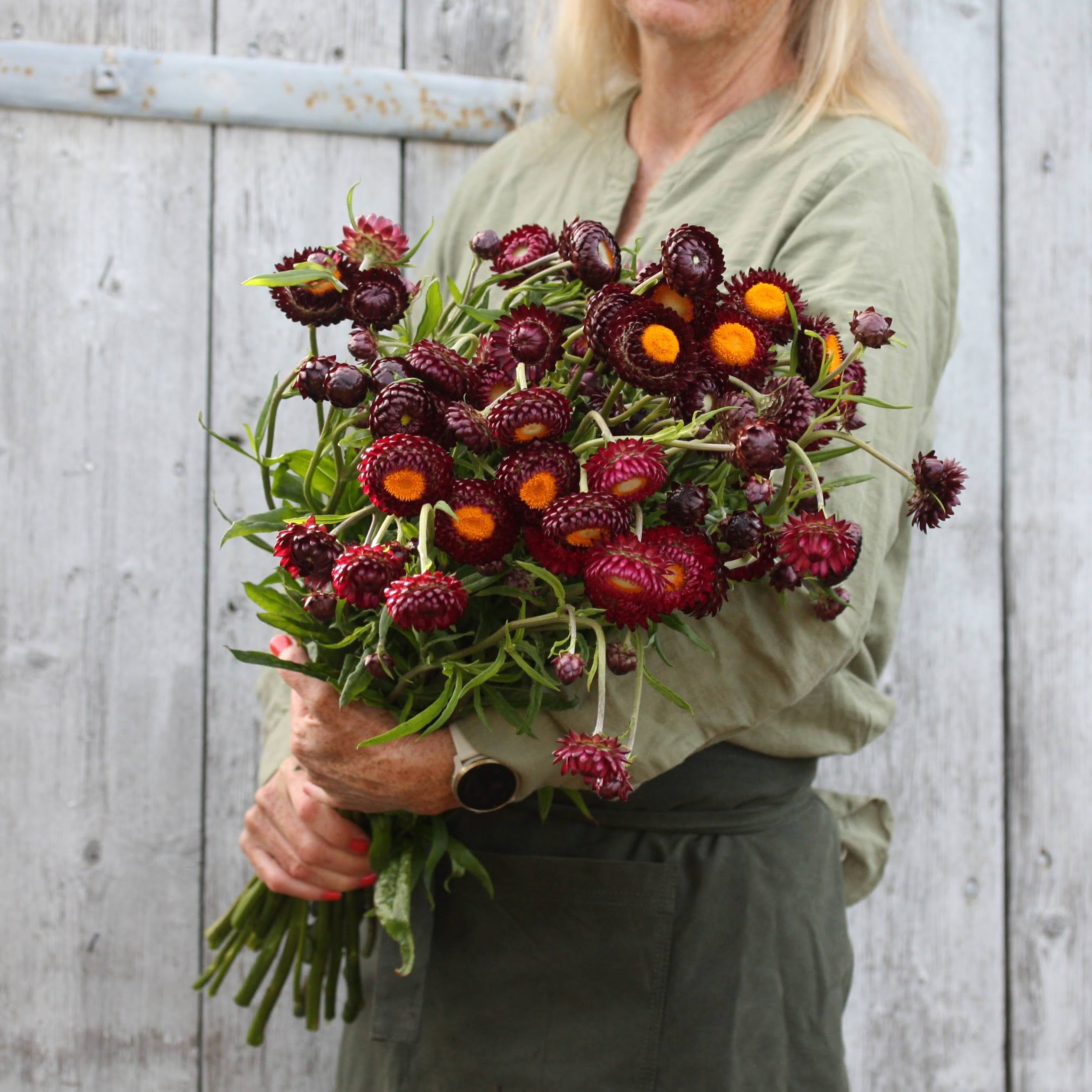 Vi høster når kronbladene begynner å åpne seg, og de står riktig lenge i vasen, siden de ser helt like ut når de tørker og dør.