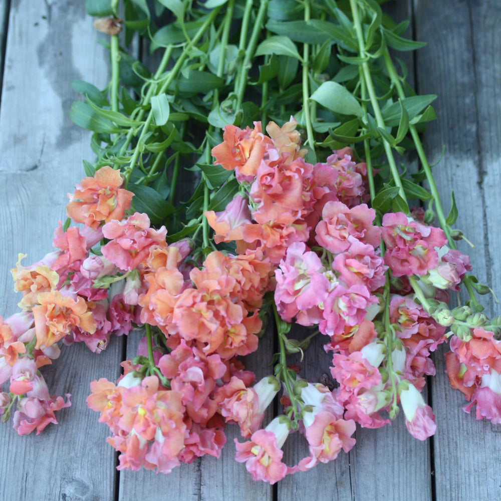 Madam Butterfly løvemunn er virkelig høyt oppe på listen over våre favoritter, den er både vakker, grei å dyrke og utrolig anvendelig i verkstedet. Denne typen løvemunnblomst kalles også azalealøvemunn, på grunn av at de er fylte som gir et fluffy utseende. Bronze with white ble hos oss et nyansespill fra fersken til rosa, mer enn hvit, men fryktelig fin!