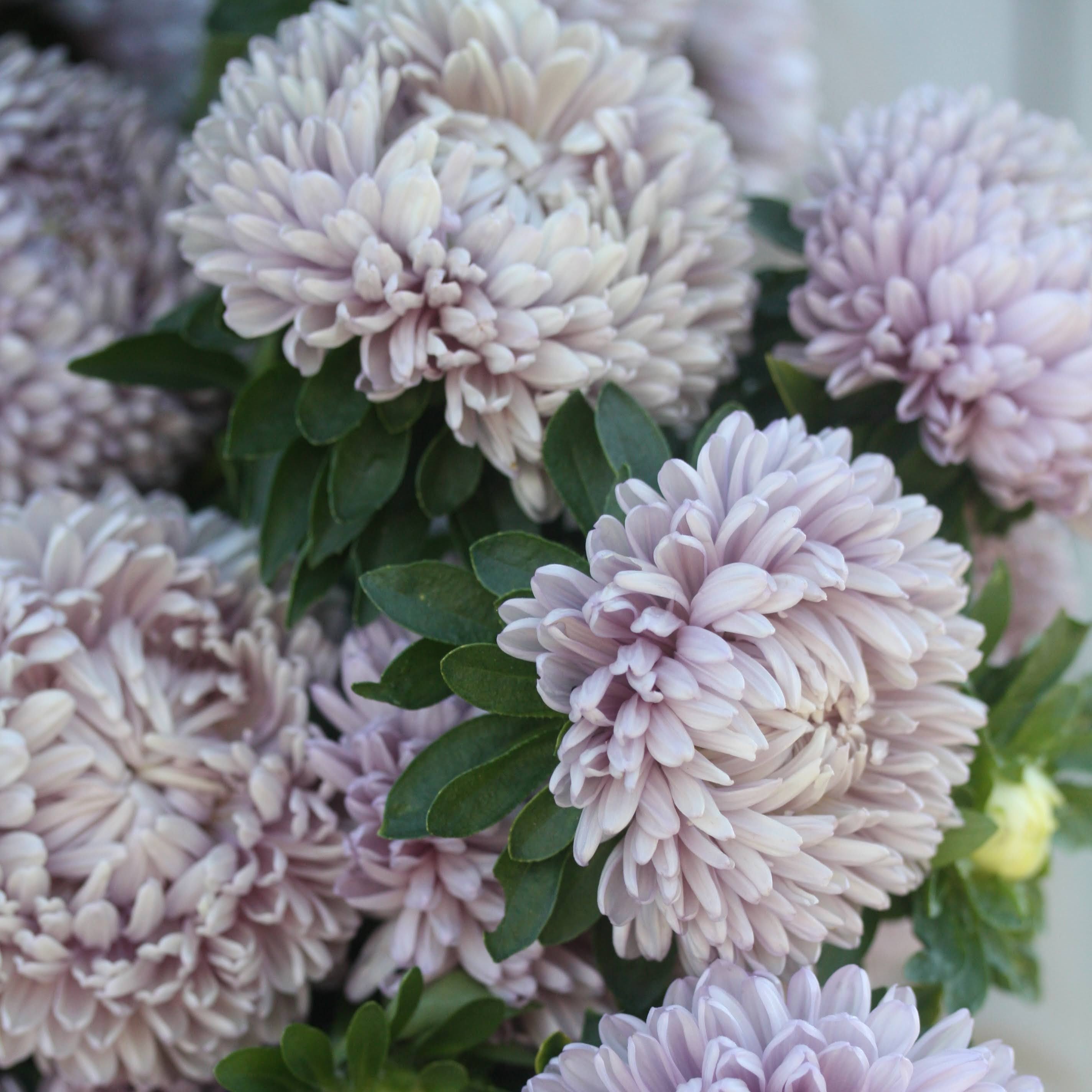 Kina asters Lady Coral Lavender er en sånn blomst som vi nesten ikke vil selge, fordi vi vil ha alle selv. Fargen er så usannsynlig fin, gråblå og melankolsk og veldig inspirerende for en blomsterbinder. Vi har sett den på bilder før vi fikk den selv, og trodde nok at bildene ikke helt fortalte sannheten. Men så var den sååå fin!