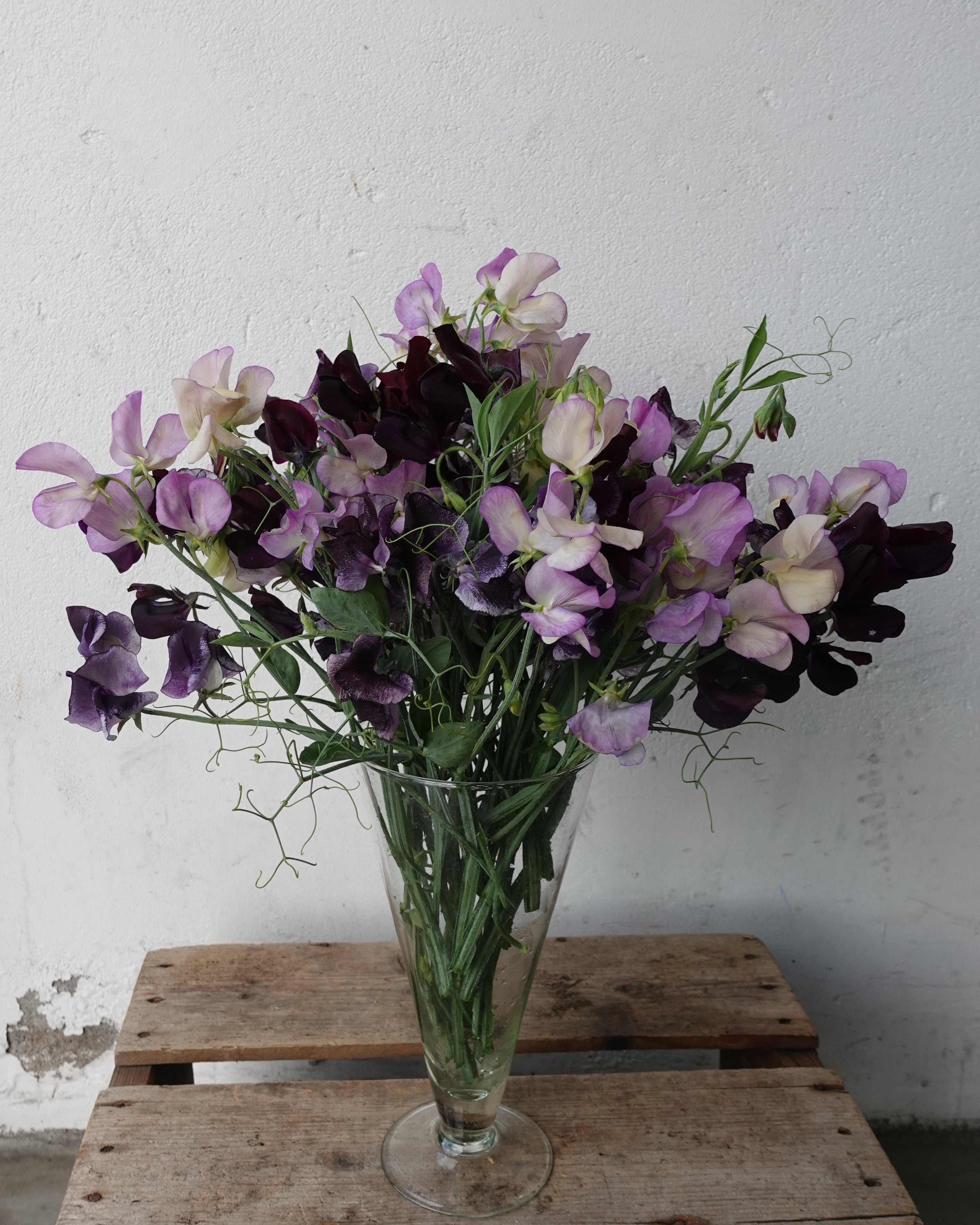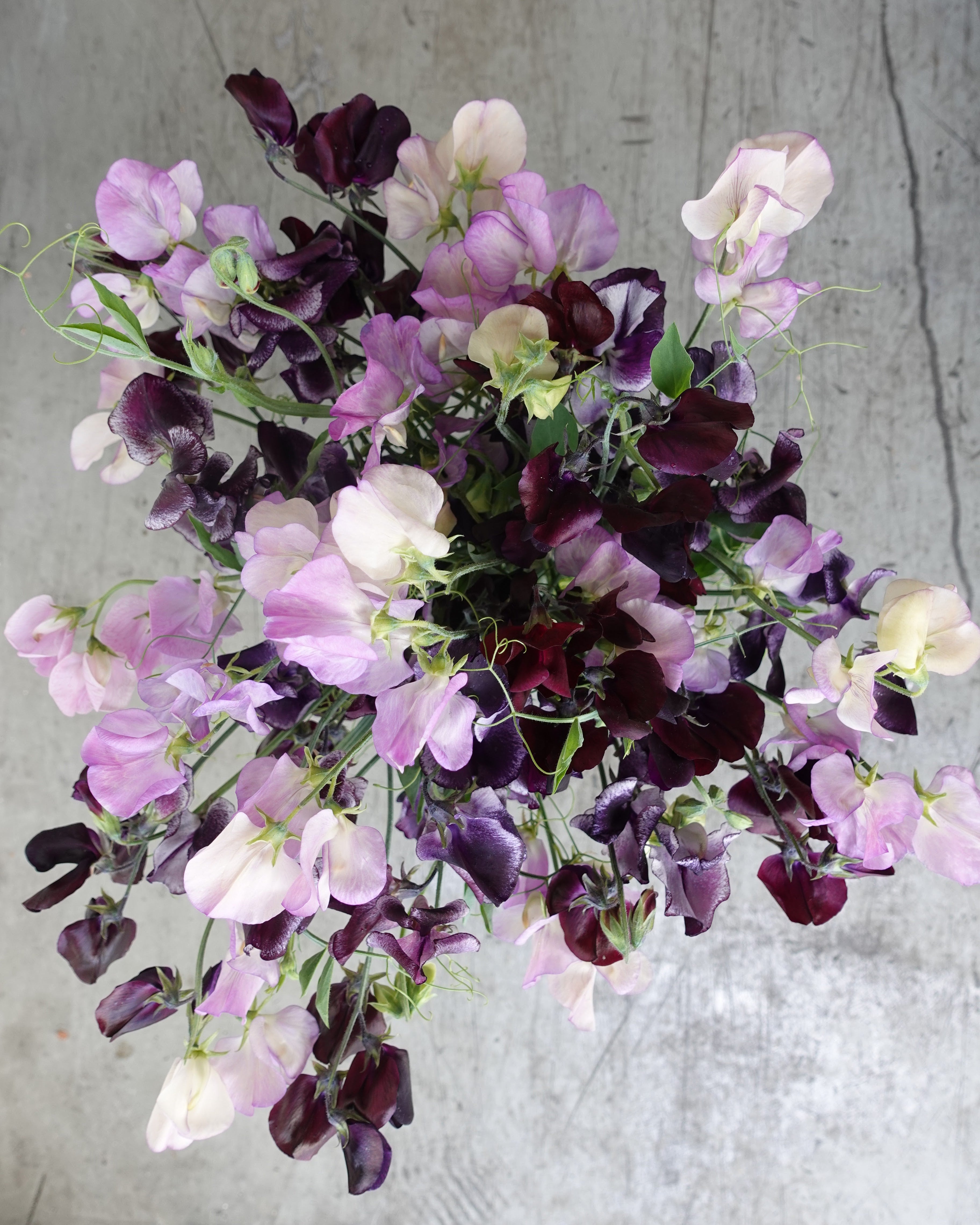 En godt komponert fargemiks gir en livlig vegg av erteblomster som er vakkert avstemt. Foreldrene til denne miksen er Almost Black, Nimus og More Scent, og sammen gir den en stemningsfull og lekkert dempet fargeskala. Erteblomster krysspollinerer i svært liten grad, så miksen vil stort sett fortsatt se ut som foreldrene.