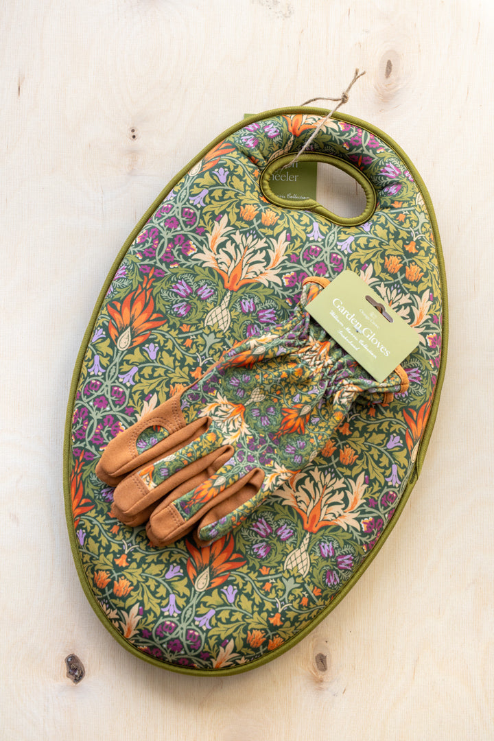 Settet inneholder hagehansker i William Morris’ elegante “Snakeshead”-mønster og en myk, støttende knepute – deilig kombinasjon av komfort, kvalitet og skjønnhet.